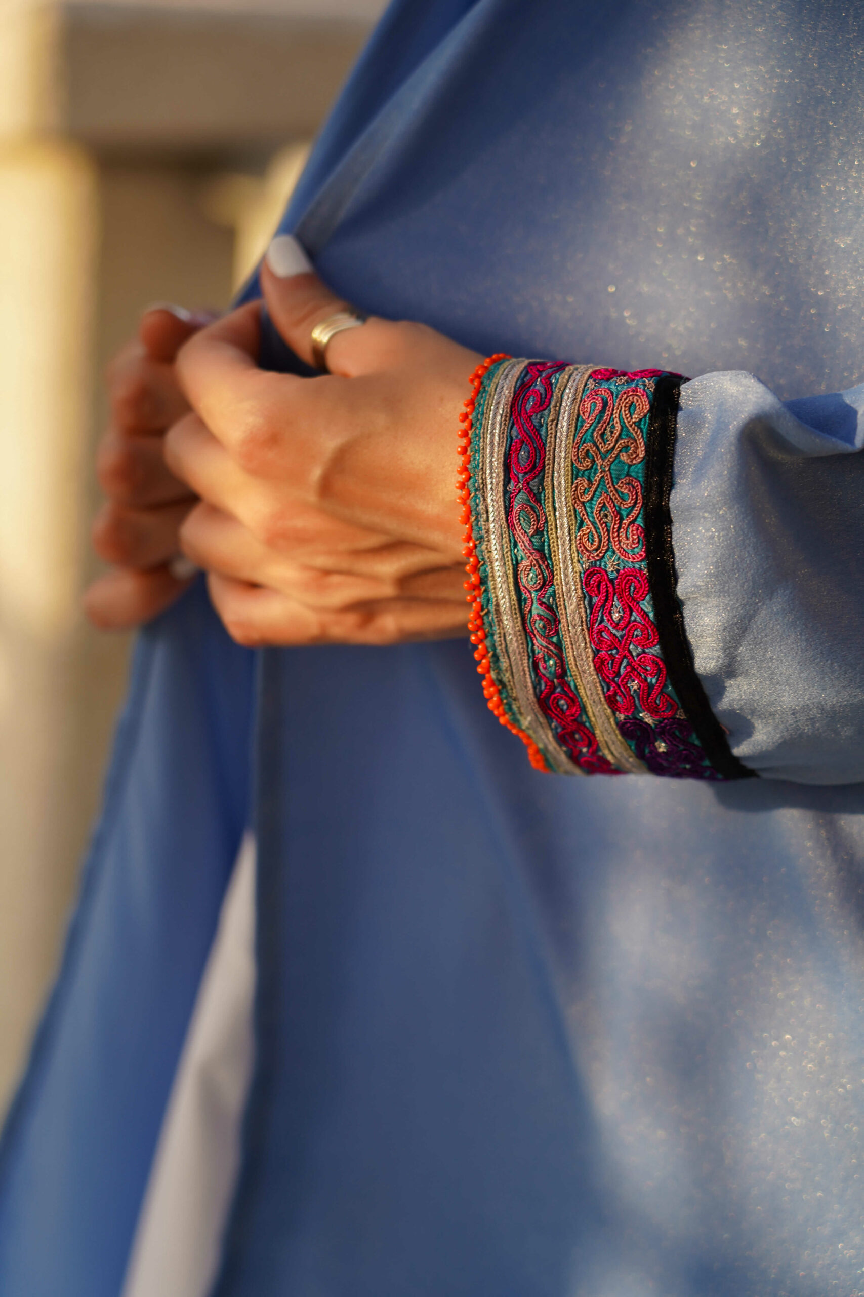 Crafted from shimmery blue fabric, this abaya features vintage Afghan embroidery on the sleeves, blending tradition with contemporary style. Available in other colors upon your request.